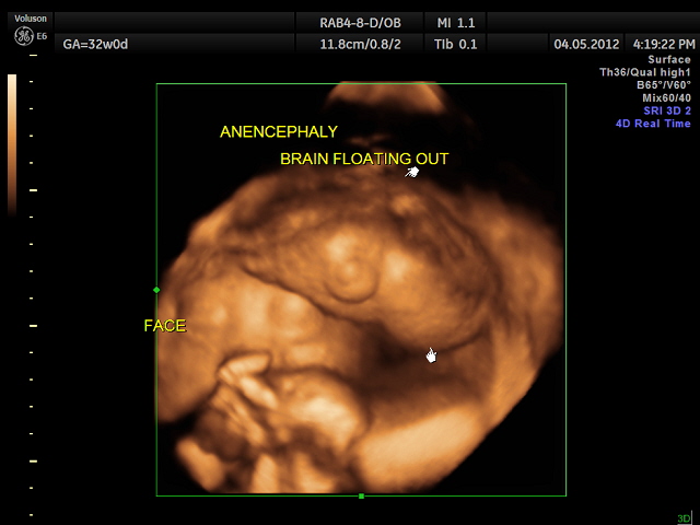 Anencephaly: 32 weeks Gestation Date: May 20, 2012Author: kriznan Category: Fetal Ultrasound Tags: 32 weeks gestation, anencephaly, calvarium, fetal brain, fetal ultrasound Post navigation NON IMMUNE HYDROPS → The image demonstrates a case of anencephaly: the calvarium (roof of the skull) is absent, and the images shows the brain floating out. Unfortunately, this was detected at 32 weeks gestation. Share this: Click to share on X (Opens in new window) X Click to share on Facebook (Opens in new window) Facebook Click to email a link to a friend (Opens in new window) Email Click to share on LinkedIn (Opens in new window) LinkedIn Click to share on WhatsApp (Opens in new window) WhatsApp More Click to print (Opens in new window) Print Click to share on Reddit (Opens in new window) Reddit Click to share on Tumblr (Opens in new window) Tumblr Click to share on Pinterest (Opens in new window) Pinterest Click to share on Pocket (Opens in new window) Pocket Click to share on Telegram (Opens in new window) Telegram Like Loading...