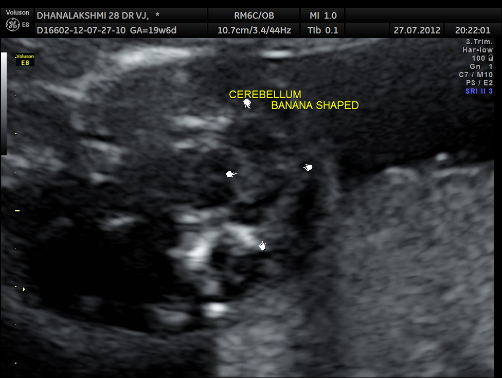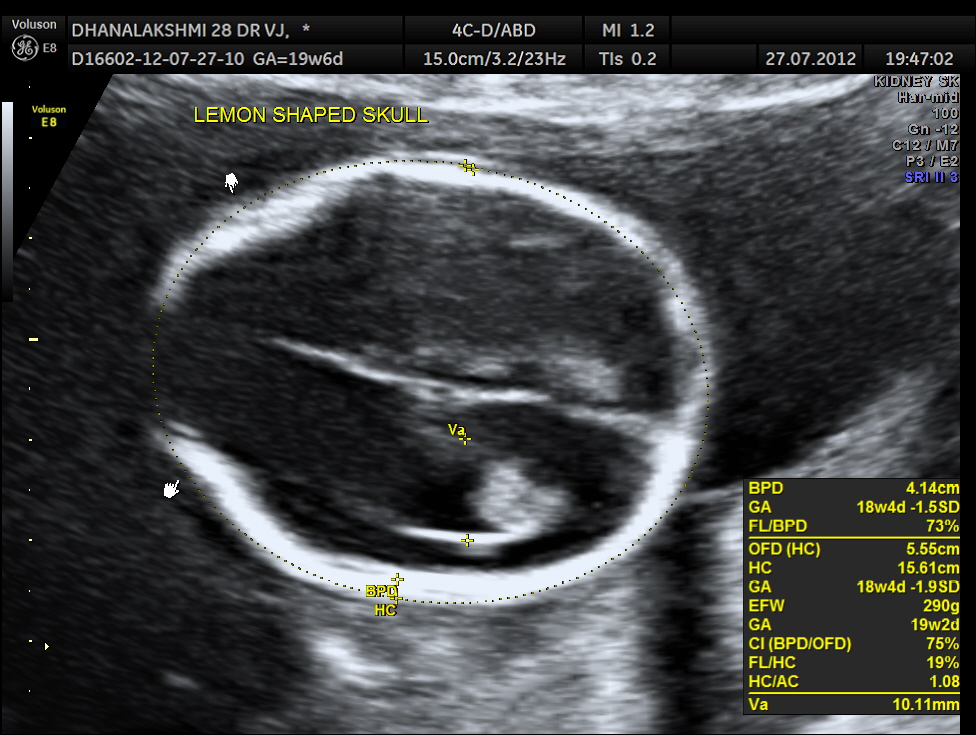 The following was the picture of the head showing the ” lemon sign”of the skull  and the” banana sign “of the cerebellum.