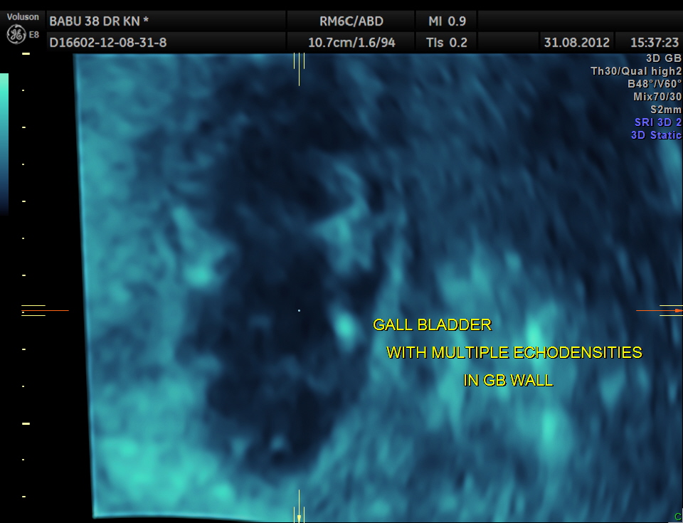 This was a 38 year old man who on a annual check up was found to have some abnormality in the gall bladder . He was asymptomatic, but on repeated questioning gave history of indigestion on taking oily food.His family physician advised him to repeat ultrasound after a year.