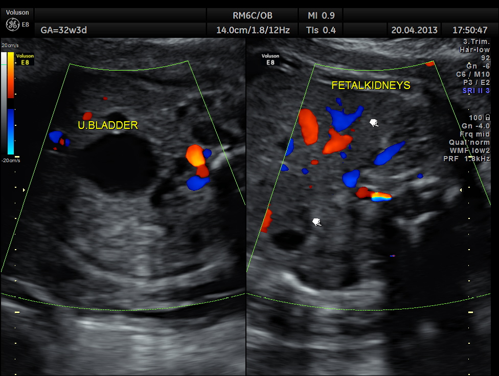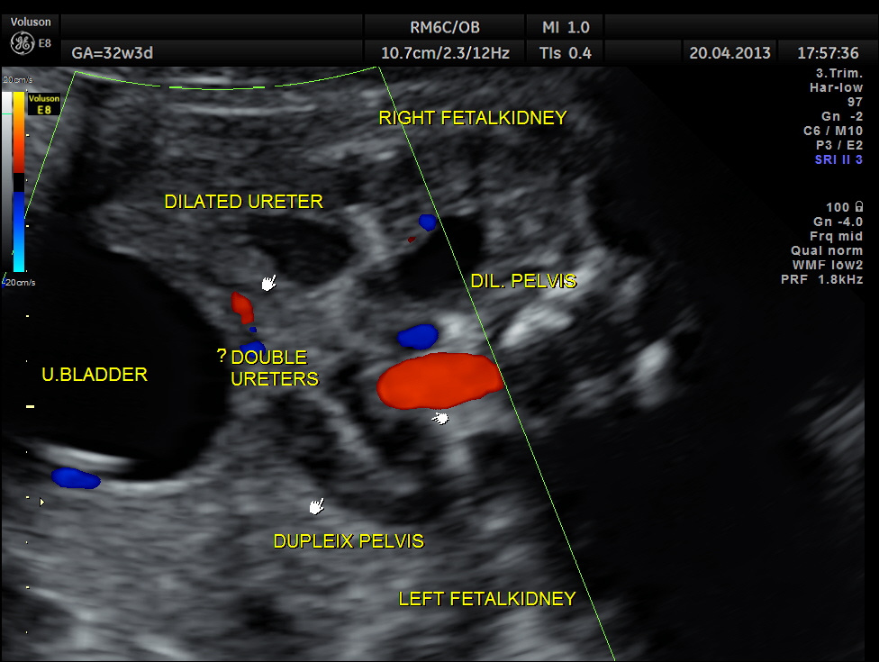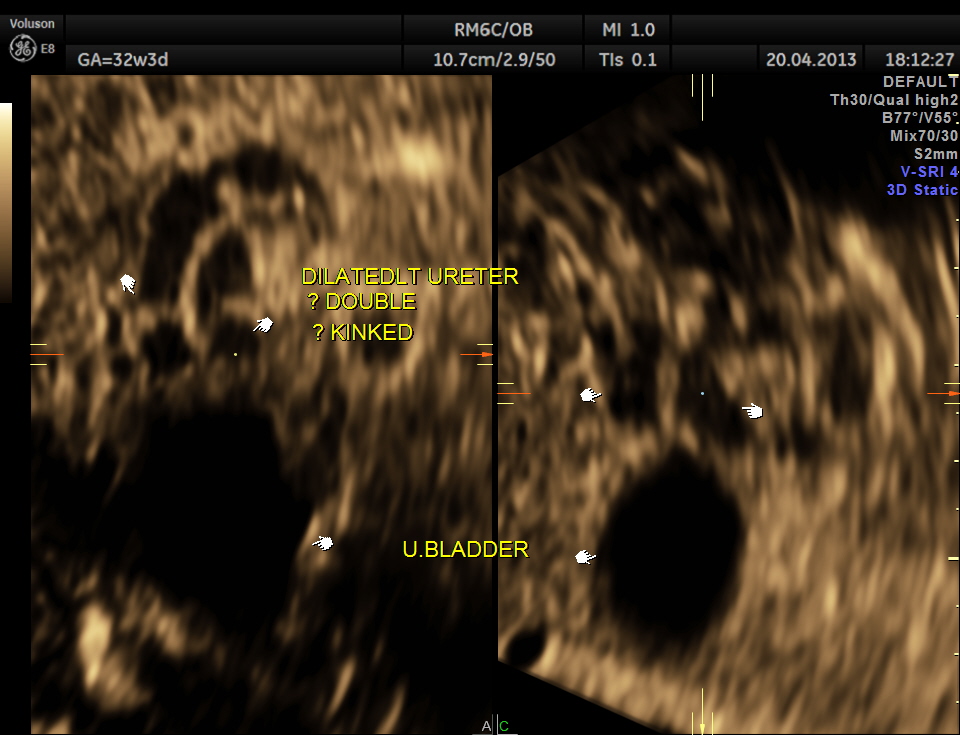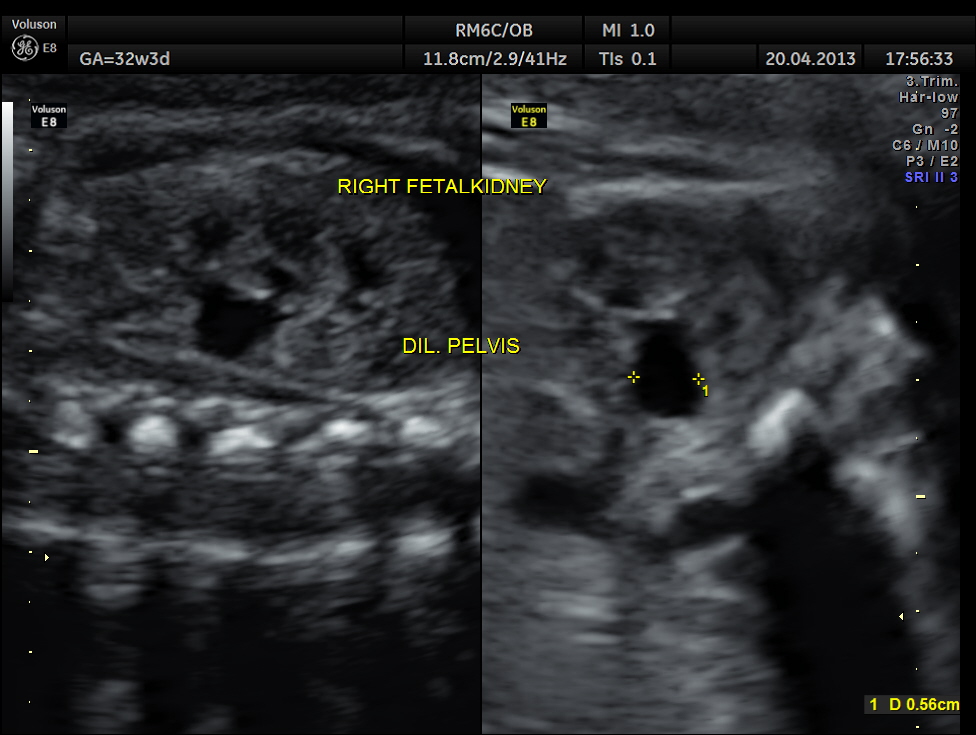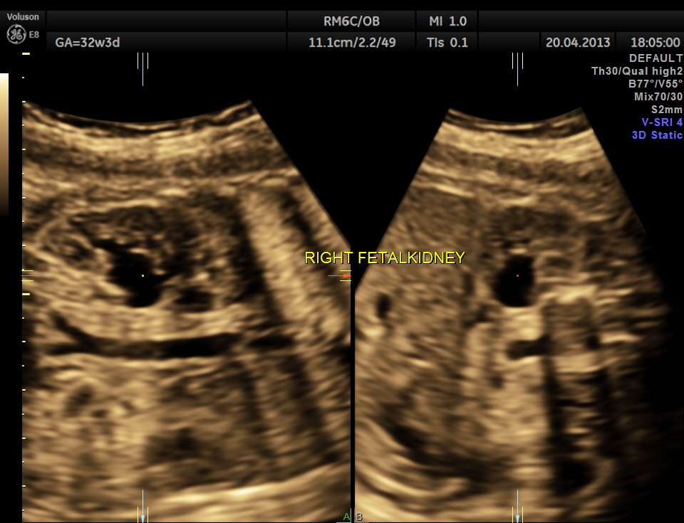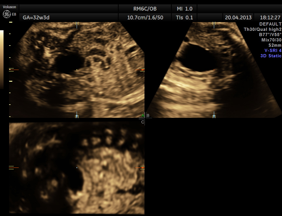 Scan was done at 32 weeks of gestation. Earlier scans have been reported as normal.