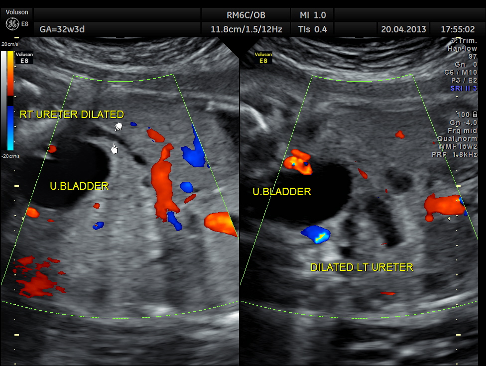 The following images show bilateral renal pelvi ectasis and bilateral dilated ureters with all the changes more in the left kidney .