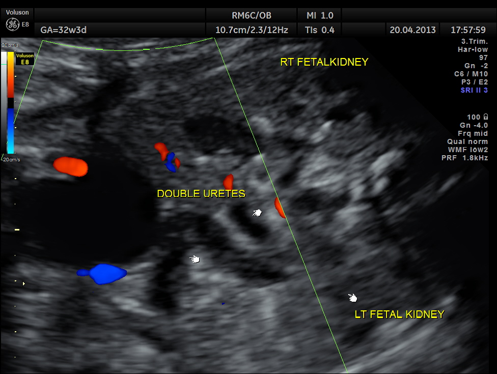 The left kidney also showed possible duple-ix pelvis with double ureters arising from them . But this finding could not be confirmed in all the views .