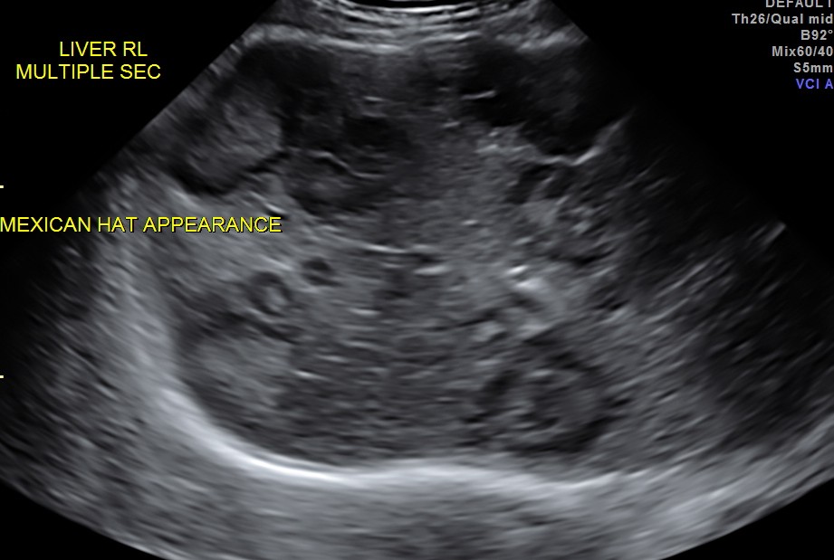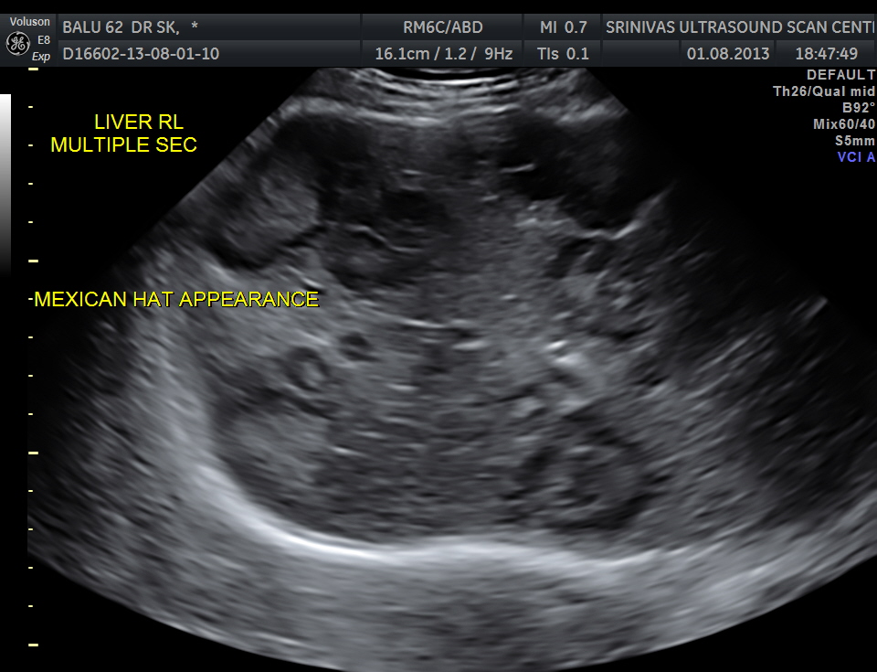 DISCUSSION : Generally the target sign or the bird’s eye view of the Mexican hat sign could signify colo-rectal carcinoma.