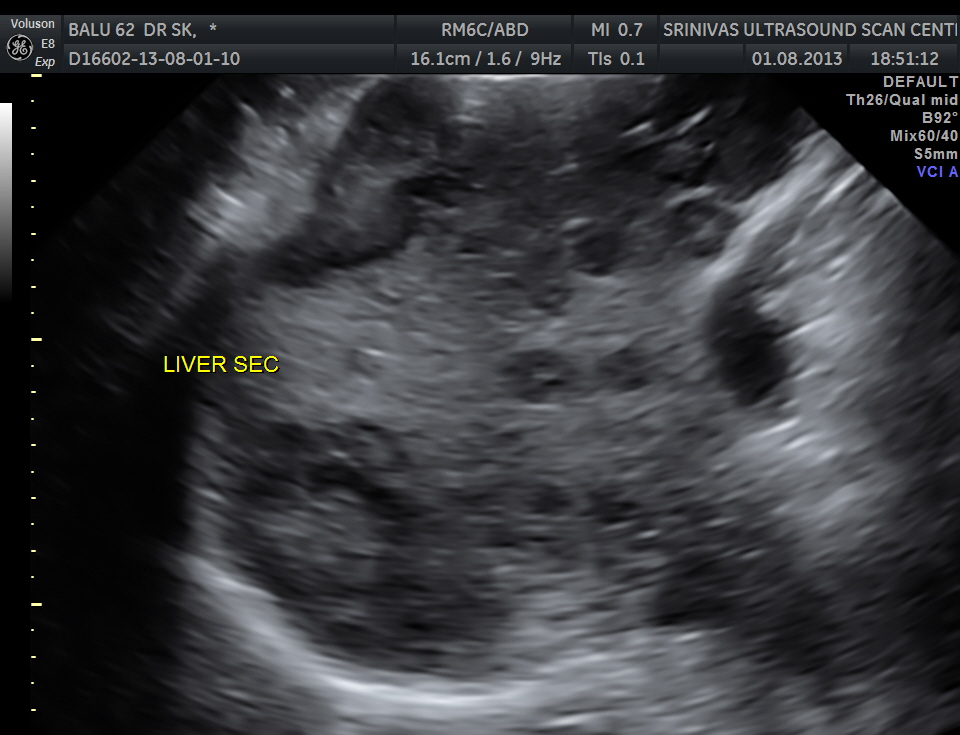 The diagnosis offered was multiple liver secondaries with incidental finding of shrunk right kidney with probable reduced function.