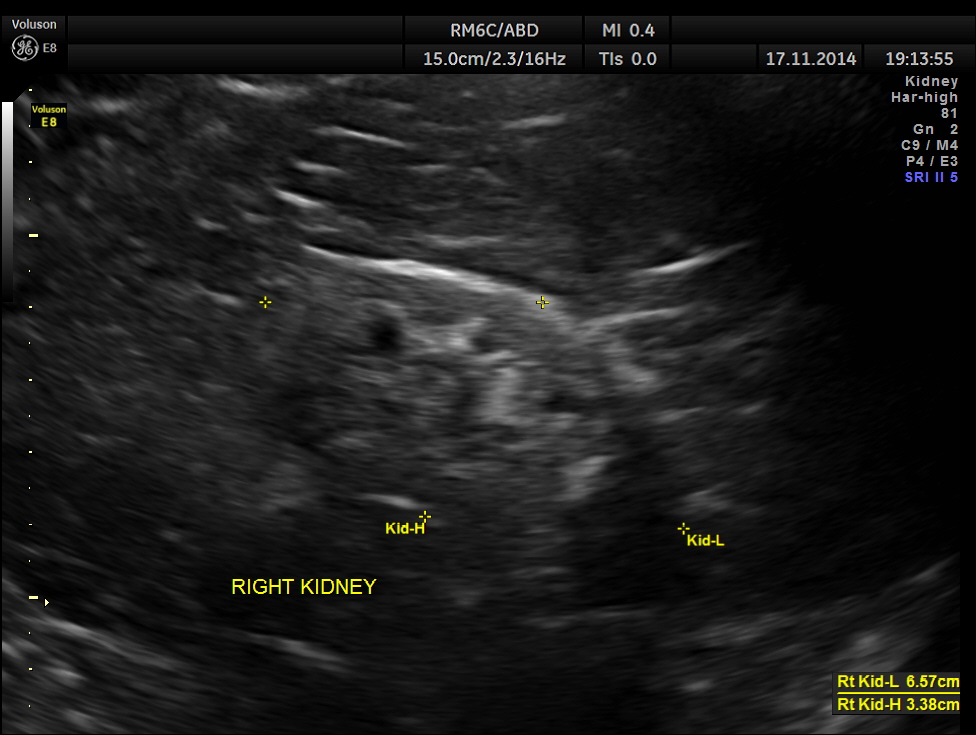 The following pictures show the native kidneys – shrunk with loss of renal architecture , with poor flow seen in Power Doppler.