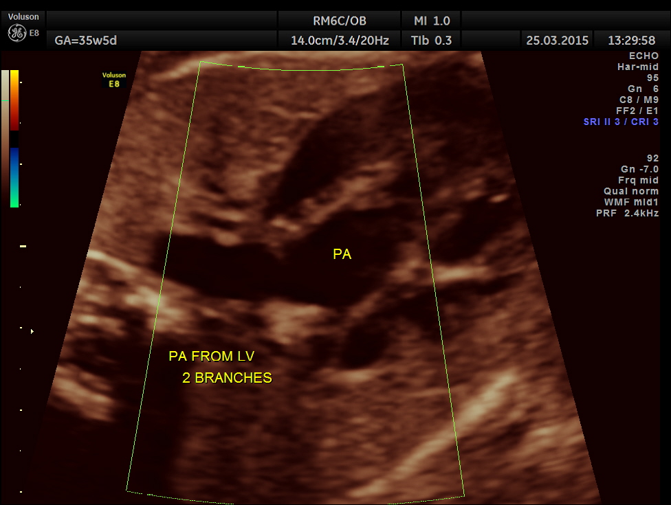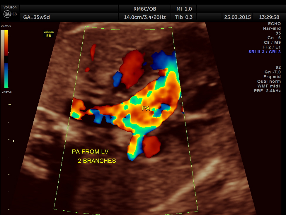 The great artery arising from the LV branches into two suggestive of pulmonary artery.