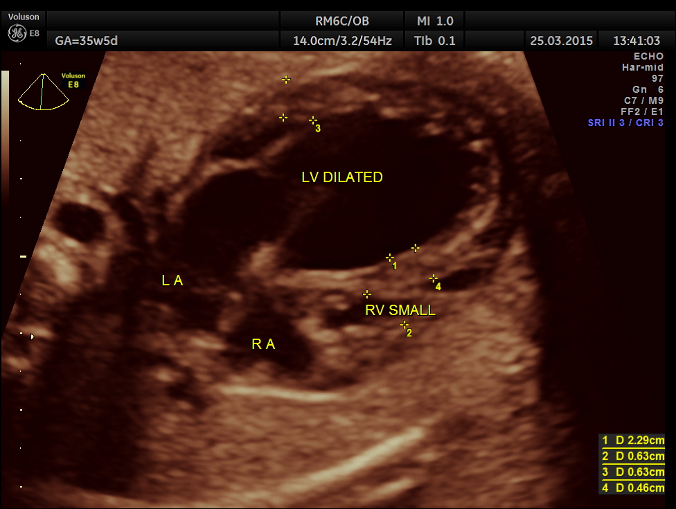 Cardiomegaly with dilated left ventricle and small right ventricle were obvious.