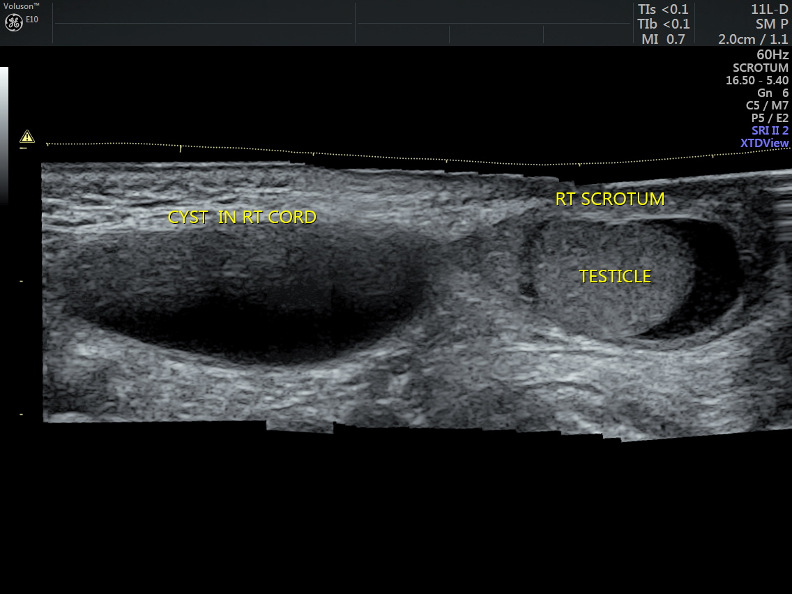 Ultrasound showed the two testicles in the scrotal sac and a cystic swelling above the right testis, distinctly separate from the same. Both the testicles appeared to have normal echotexture.